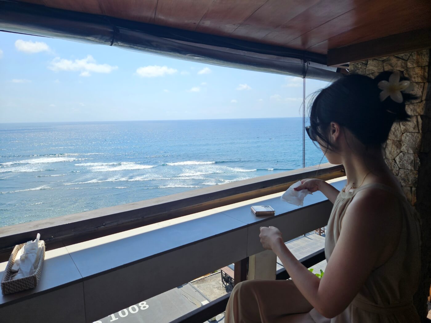 발 아래에는 울루와뚜 해변과 해변가에 있는 여러 숙소와 수영장들도 보였고, 해변에서 서핑을 하고 있는 사람들도 상당히 많이 보였습니다. 저희는 서핑하는 사람들과 아름다운 바다를 보면서 천천히 점심을 먹었고, 오늘이 발리에서의 마지막 날이라고 생각하며 더 열심히 발리의 풍경을 눈에 담았습니다.